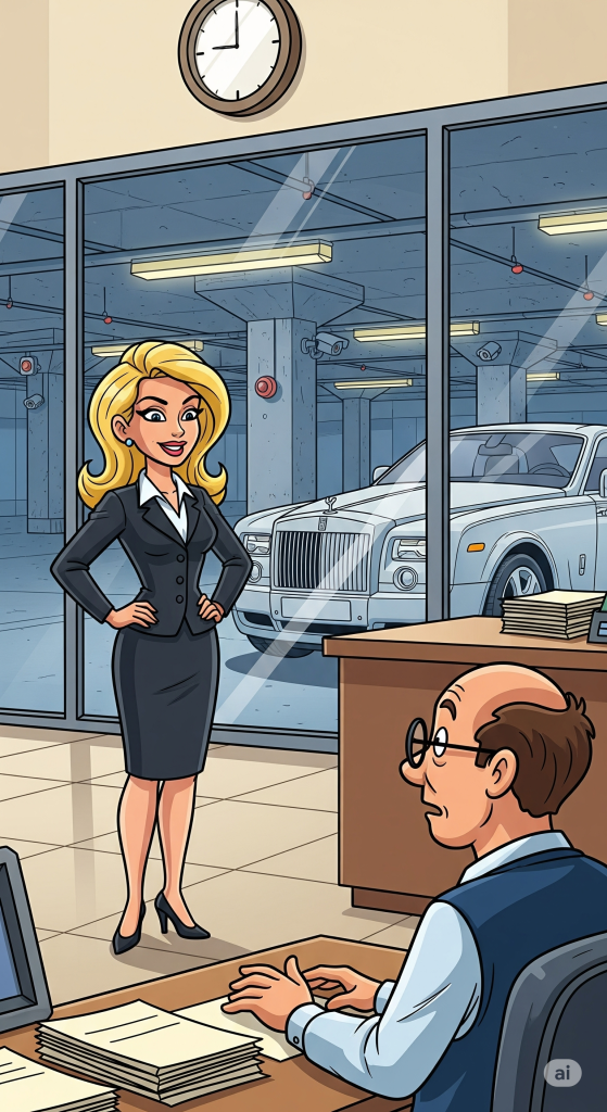 The bank officer says the bank will need some kind of security for the loan, so the blonde hands over the keys to a new Rolls Royce.