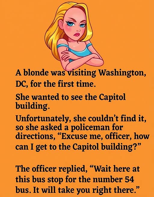 Unfortunately, she couldn’t find it, so she asked a policeman for directions, “Excuse me, officer, how can I get to the Capitol building?”