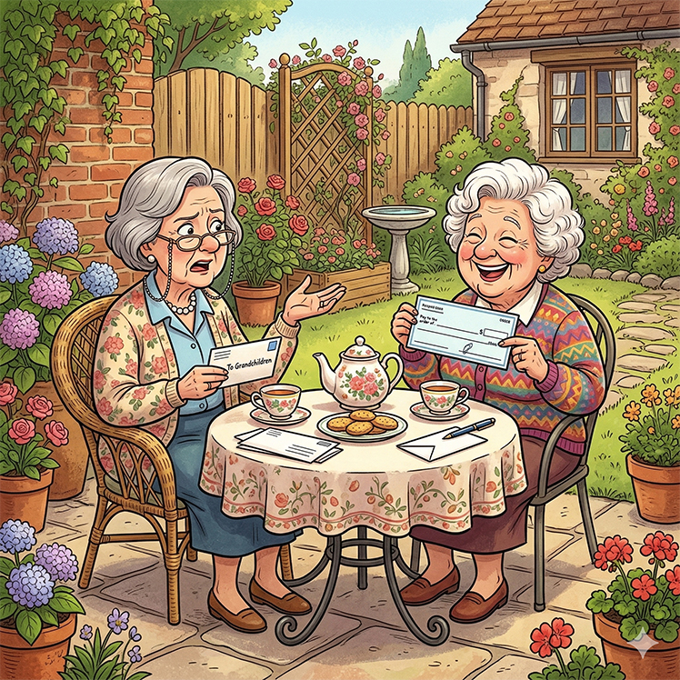 The second old lady said, “Oh, I also send checks to my grandchildren, and they visit me all the time!”