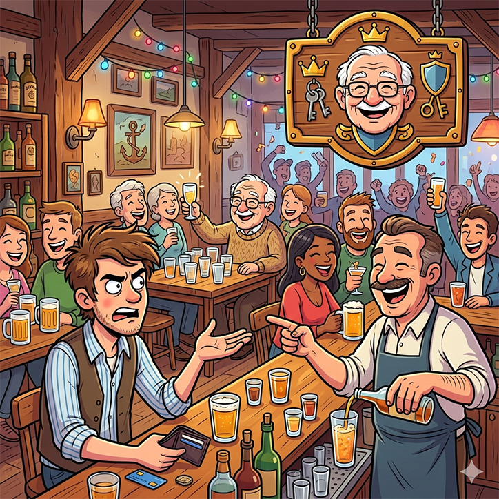 Confused, the guy orders another round for everyone—again, except for the old man—and this time, he insists on only the top-shelf stuff.