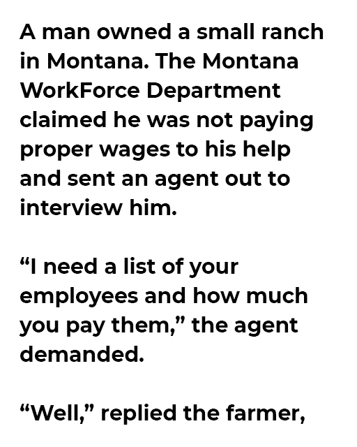 “Then there’s the half-wit. He works about 18 hours every day and does about 90% of all the workarounds in the ranch. He earns about $10 per week, pays his own room and board, and I buy him a bottle of bourbon every Saturday night.”