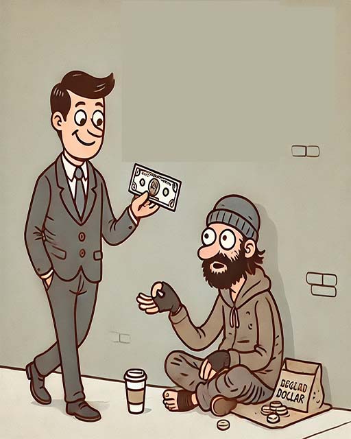 “What’s going on now?” The beggar asks his donor.