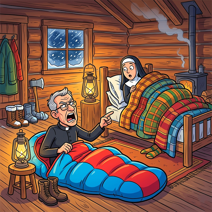 A priest and a nun were lost in a blizzard. After a while, they came upon a small cabin.