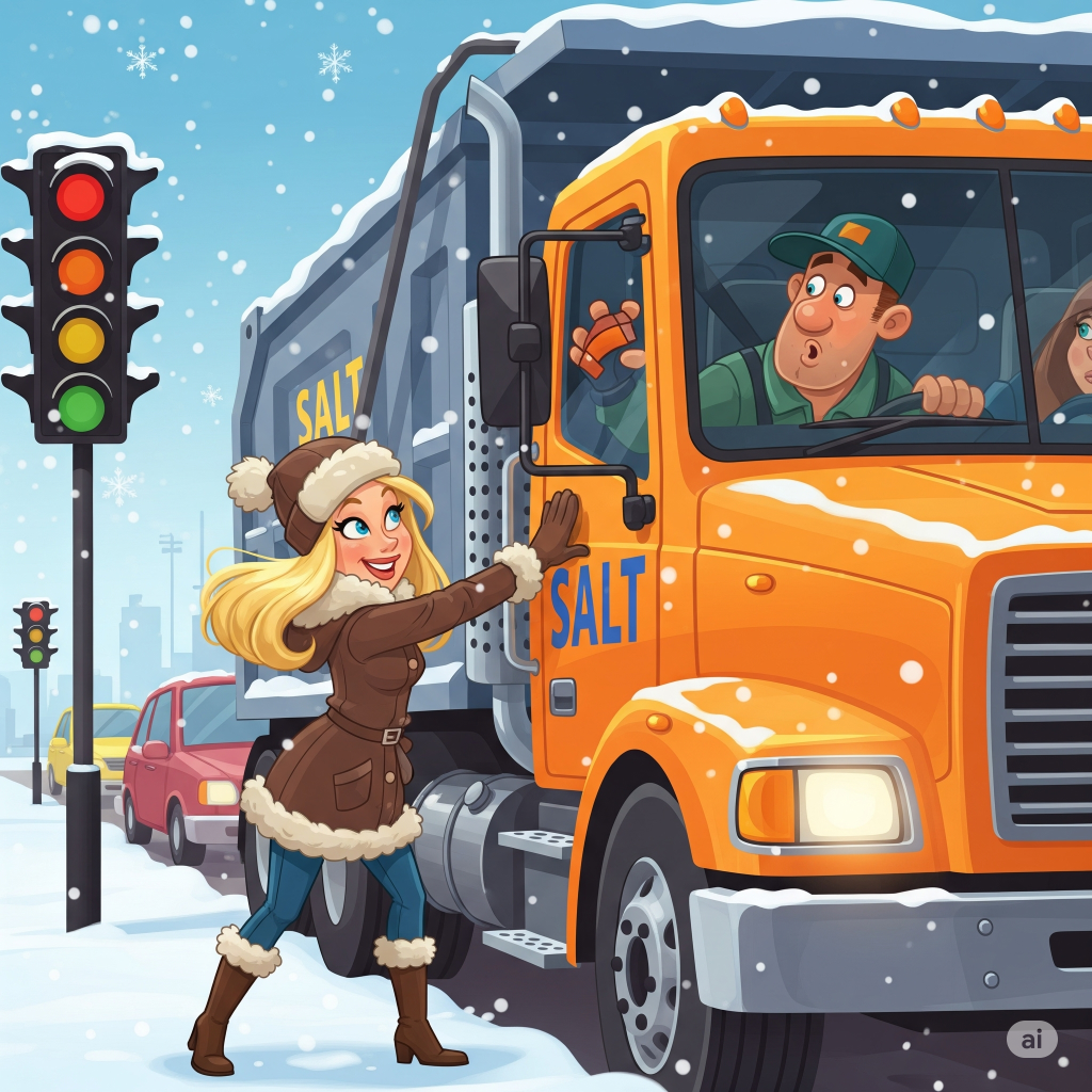 The trucker looks at her, and finally, he says, “Hi, my name is Kevin, it’s snowing, and I’m driving a salt truck.”