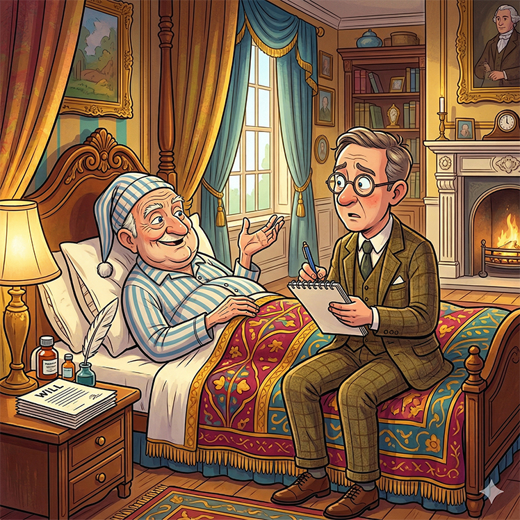 A wealthy old man was lying on his d3athbed when it occurred to him that he had never made a will.