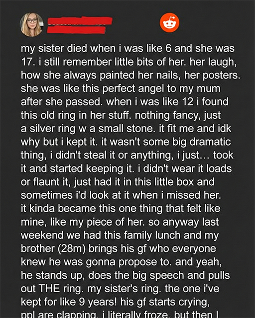 It was simple: silver, thin-banded, with a tiny blue stone set at the center. Nothing flashy. Nothing expensive. It was tucked into the back of her jewelry box, almost forgotten.