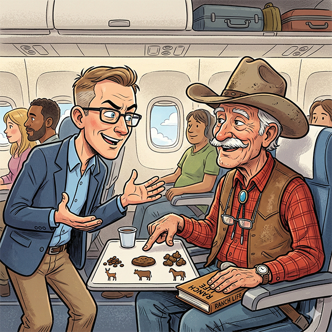 The cowboy paused, then said, “Those could be interesting topics, but let me ask you something first. A horse, a cow, and a deer all eat grass. Yet, a deer leaves little pellets, a cow produces flat patties, and a horse makes clumps. Why do you think that is?”