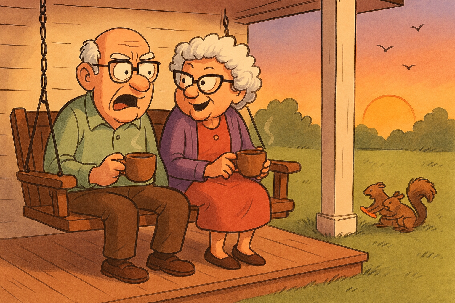 They’ve been married for 55 years. The sun is setting, the birds are chirping, and they’re both sipping lukewarm tea, watching squirrels fight over a Cheeto in the yard.