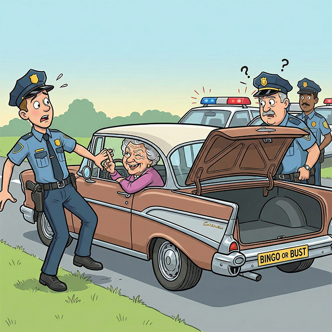 An elderly woman was driving along at 65 in a 40 mph zone, rushing to get to her weekly bingo game, when a police officer pulled her over.