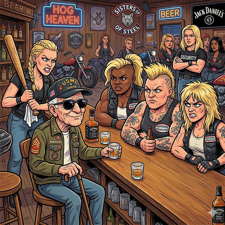 An old, blind Marine accidentally stumbles into an all-girl biker bar, completely unaware of his surroundings.