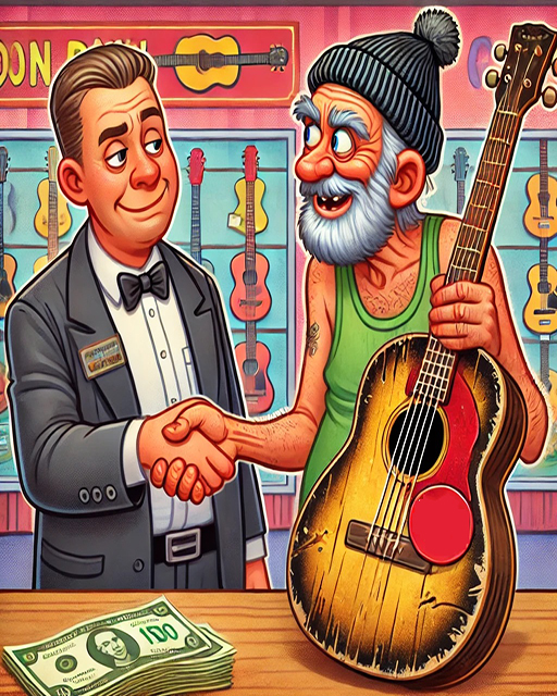 An old man walks up to the counter of a pawn shop with an old, weathered guitar: “I’d like your expert opinion on this guitar. How much do you think it’s worth?” asks the old man.