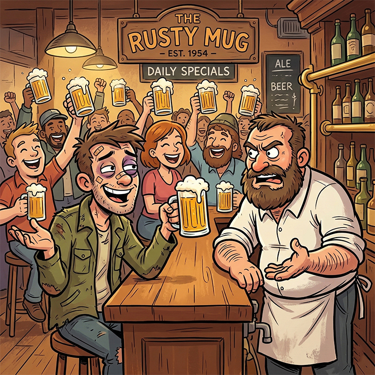 The bartender thinks, “The man can’t be stupid enough to do the same trick twice; he must have enough money tonight,” and gives beer to everyone.