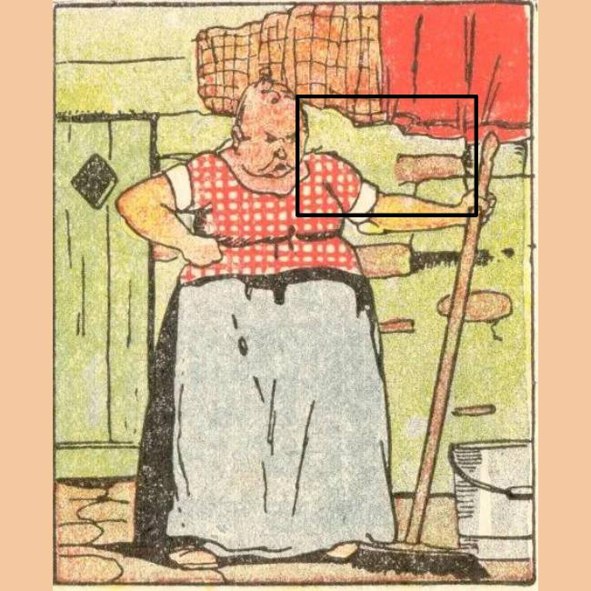 You will see an image showing an old woman in front of her house, looking for something.