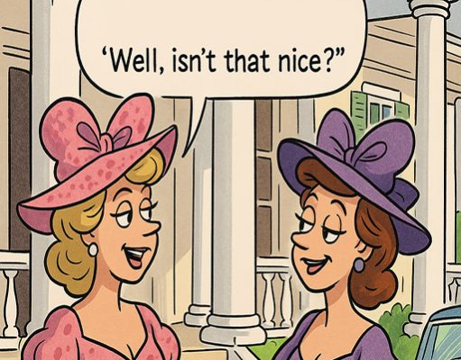 Two Southern Belles were chatting on the porch of a grand white-pillared mansion.