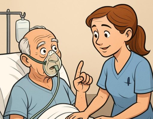A man was lying in a hospital bed, hooked up to oxygen, recovering from surgery.