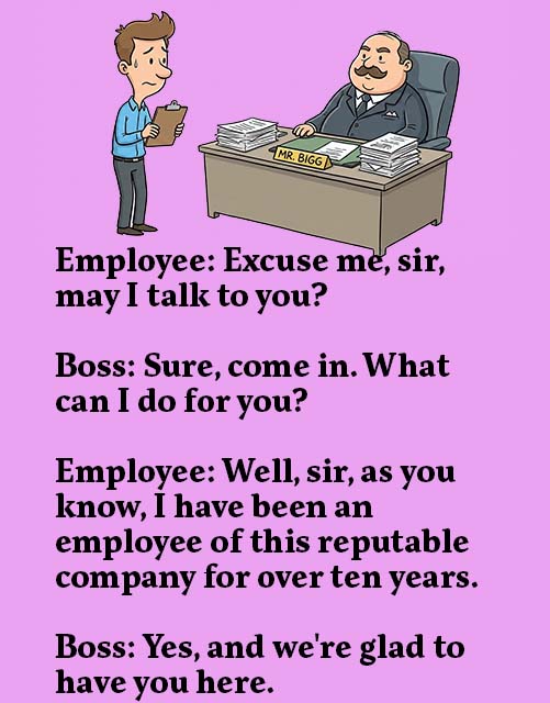 Employee: As you are aware, sir, I have been a loyal employee of this reputable company for over ten years.