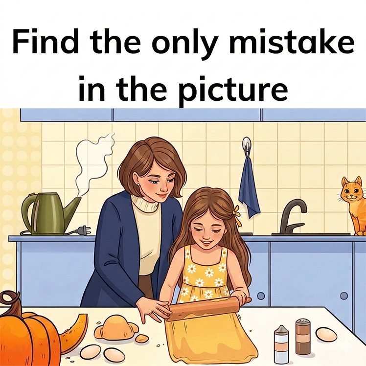 The image shows a heartwarming scene of a mother and daughter working together to roll out dough in the kitchen. It looks cheerful and familiar, but a couple of subtle errors are hidden within this everyday setting. Can you find them?