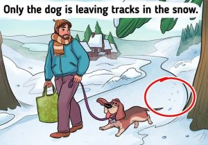 Look closely. See anything off? At first, it might seem fine, but there’s a mistake. The man and his dog are walking in the snow, right? But here’s the twist: there are no footprints from the man, only the dog leaves tracks.