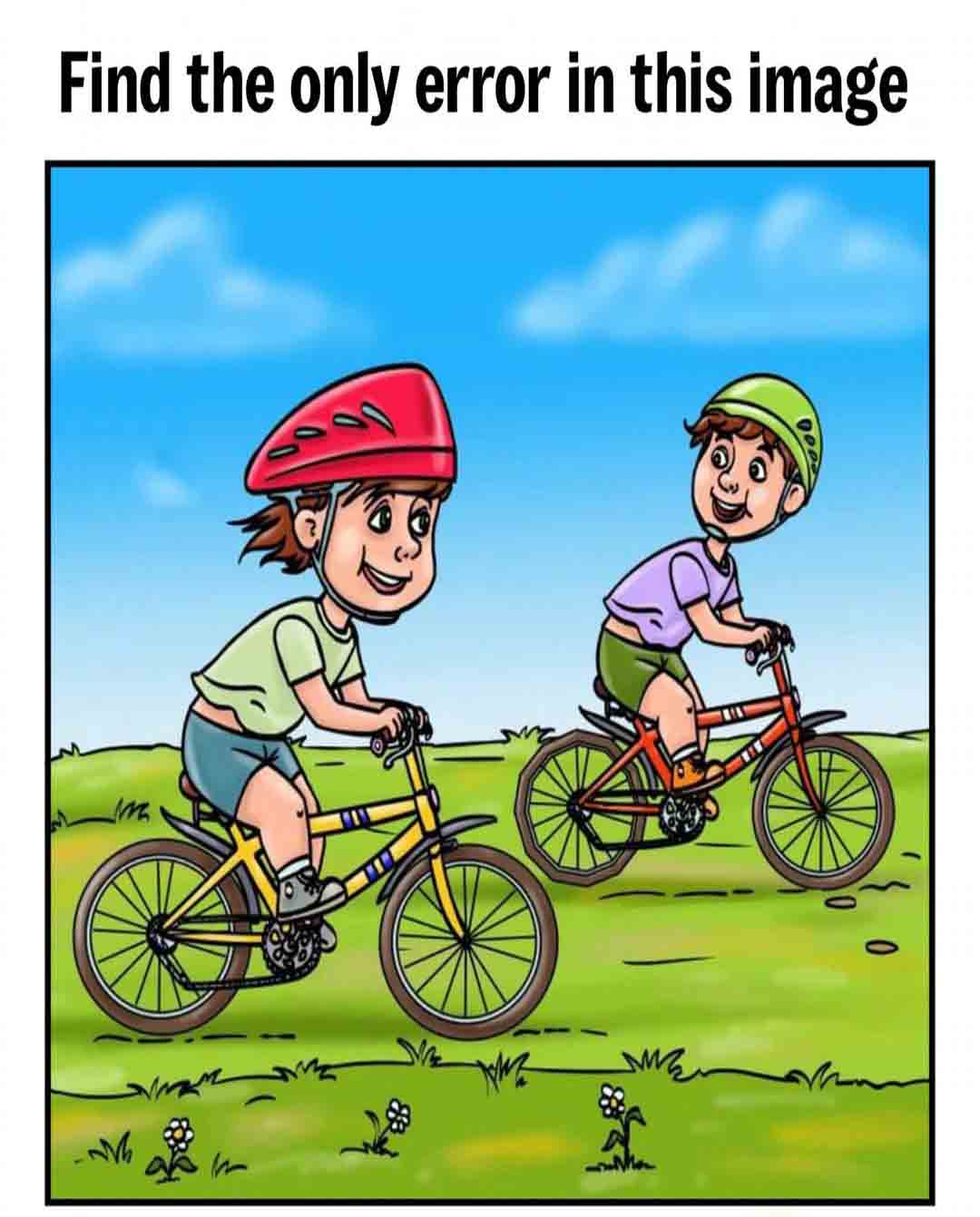 The kid riding with a green helmet has the cycle whose rear tyre is of a dodecagon structure instead of a complete circular shape.
