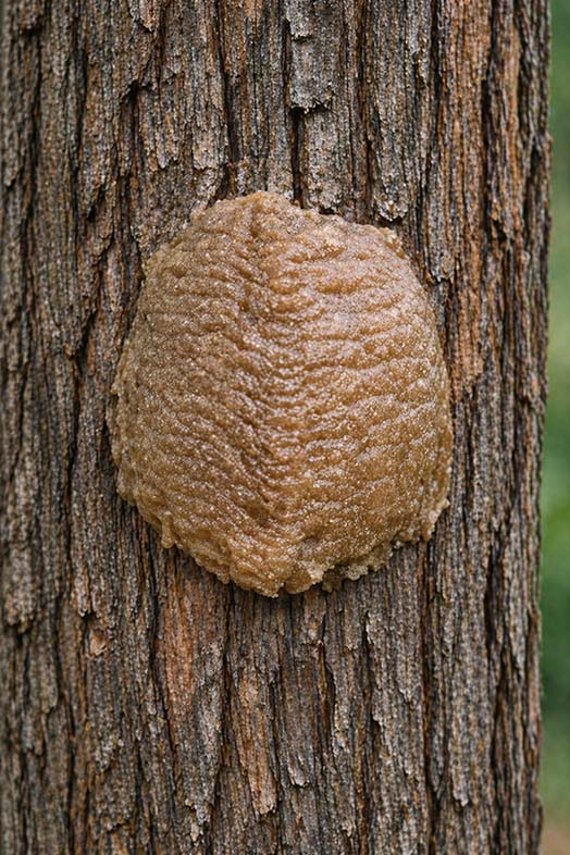 A mantis ootheca is firm, ridged, and foam-like in appearance.