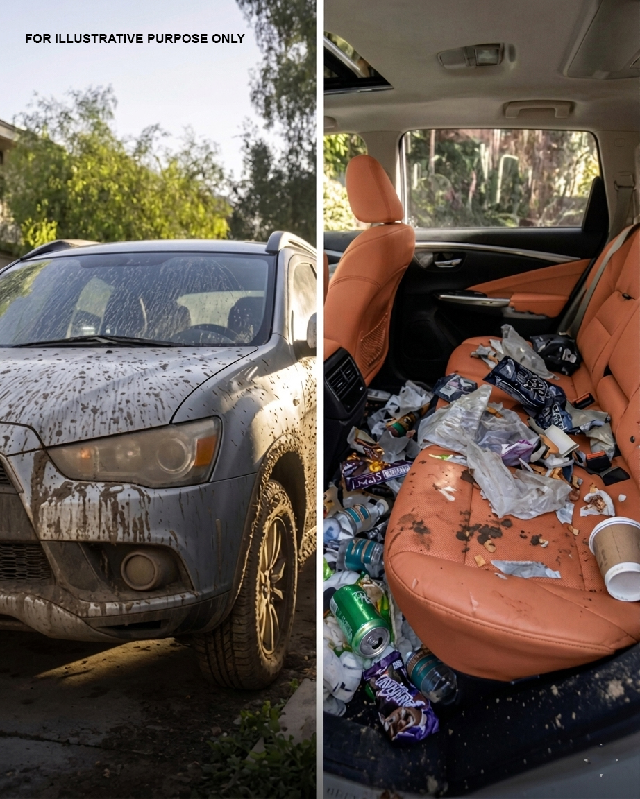 Crumbs covered the seats. Sticky residue clung to the cup holders. There were grease stains, juice spills, crushed snacks, and the unmistakable smell of fast food lingering in the air.