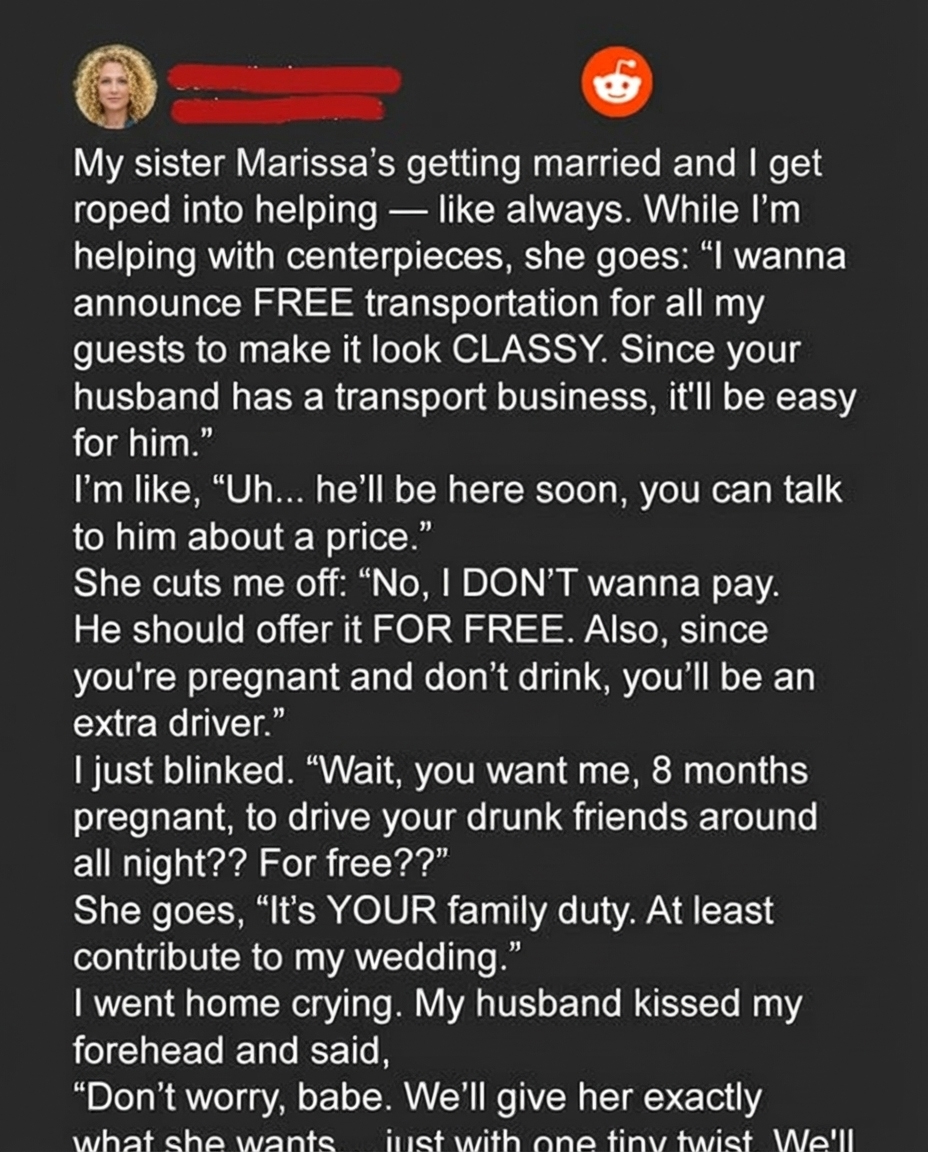 In the car, I told him everything. About the transportation. About being expected to drive. About the printed programs that already advertised “complimentary luxury service provided by the bride’s sister and brother-in-law.”