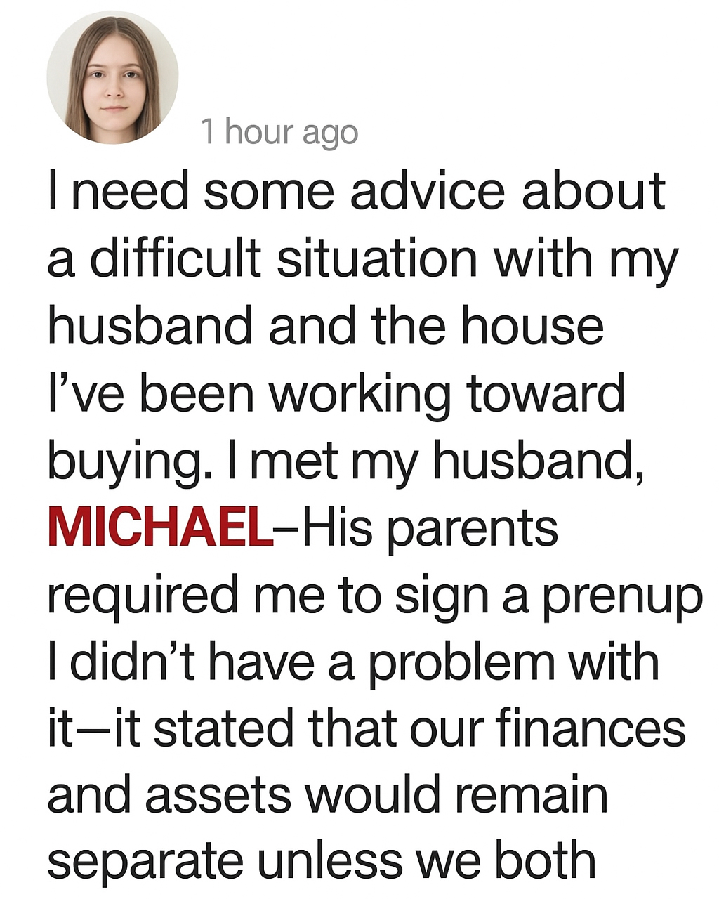 Since then, we’ve been living in a house owned by his parents. Michael has never really wanted to purchase a home of our own, but I’ve always dreamed of it. I’ve worked hard, saved carefully, and eventually managed to put together about 35% of a down payment. Recently, I finally found a house that feels perfect for me, something I could truly call my own.