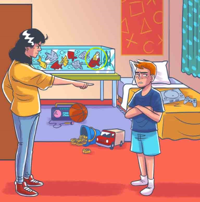 Toys are strewn across the room, and a bed with a yellow cover is visible on the right side of the picture.