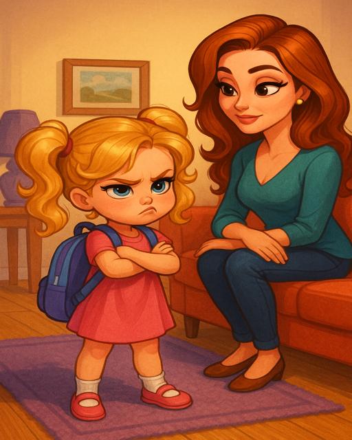 She stomped into the house, plopped her tiny backpack onto the floor, and crossed her arms with a dramatic sigh.