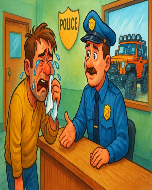 The sergeant, touched, hands him a tissue: “There, buddy. We’ll find your Jeep.”