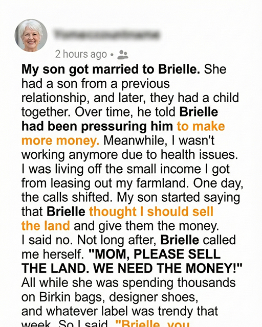 That land wasn’t just property. It was a memory. It was a legacy. My late husband had proposed to me beneath the cedar tree on the north ridge, his hands shaking as he held the ring. We raised our son there, paid his tuition with its harvests, and when the land was leased to a small organic cooperative, it became my security in retirement.