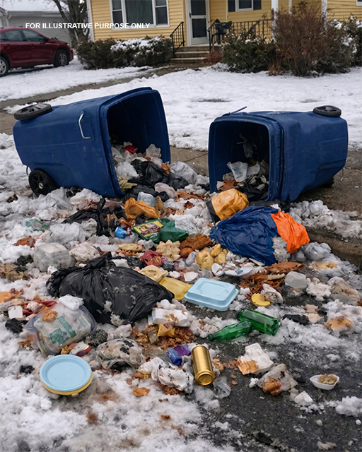 They toppled instantly. Bags split open. Garbage spilled across the snow.