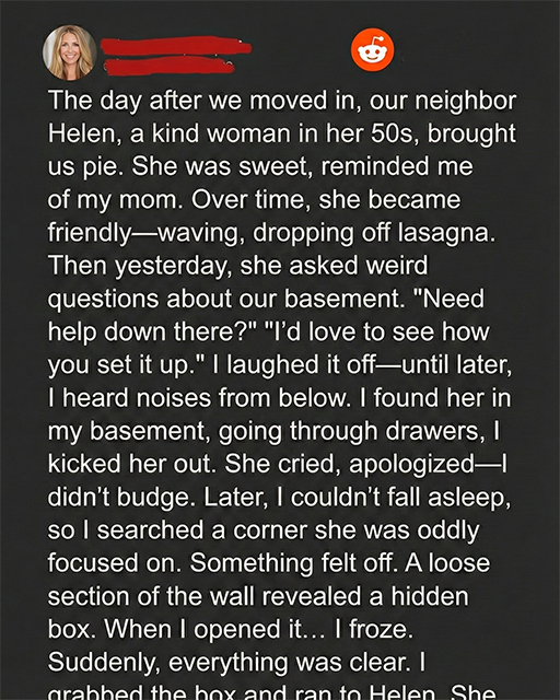 Helen stopped by unexpectedly while my husband was out and the kids were upstairs doing homework. We chatted casually in the kitchen, but her energy felt different that night. Restless. Distracted. She kept glancing toward the hallway that led to the basement stairs, her fingers tapping nervously against the counter.