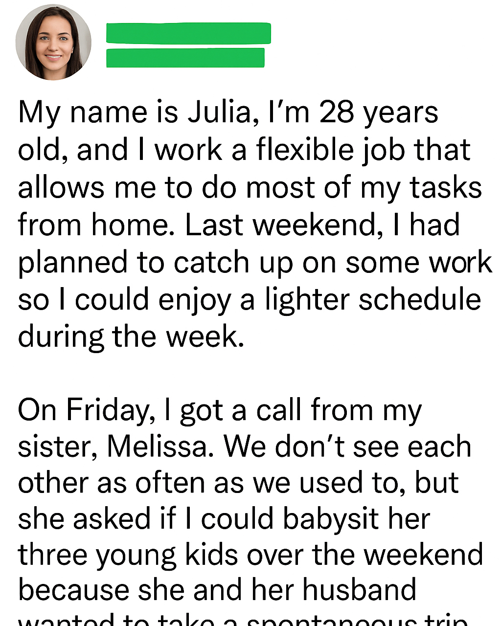 My name is Julia, I’m 28 years old, and I work a flexible job that allows me to do most of my tasks from home. Last weekend, I had planned to catch up on some work so I could enjoy a lighter schedule during the week.