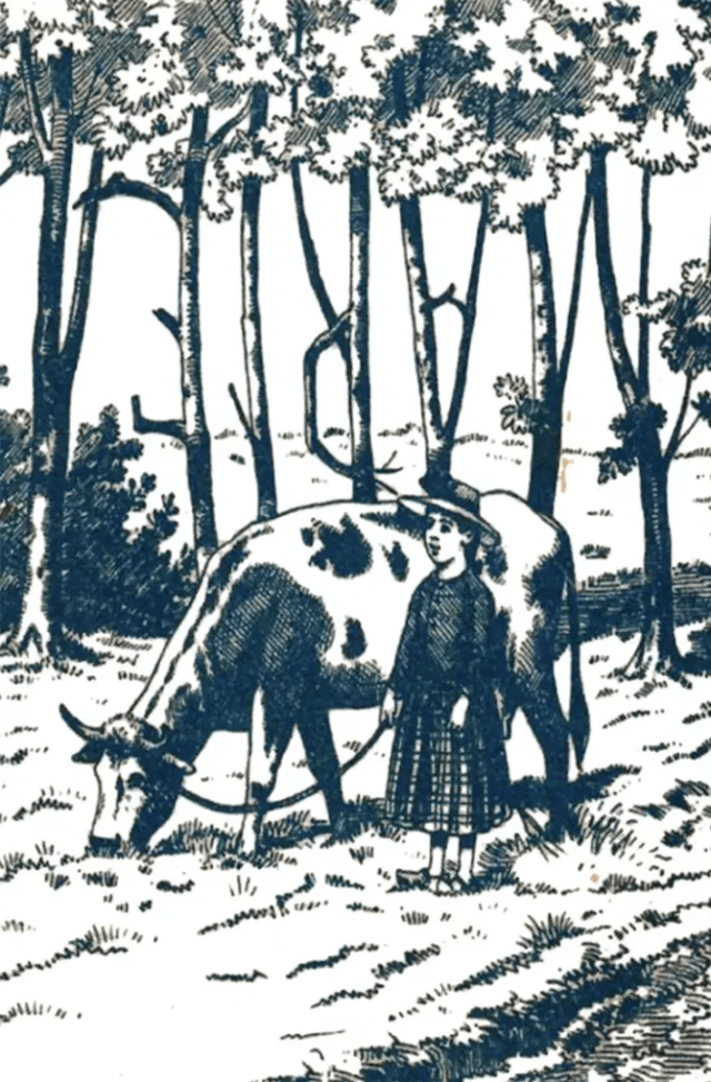 The scene features a girl holding a cow on a rope, but there is another girl lost in the woods.