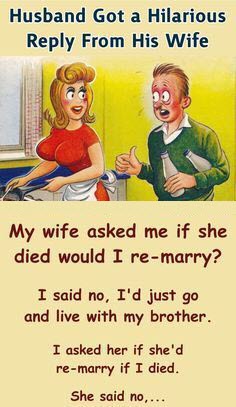The wife turns to her husband and asks, “Darling, if I were to pass away, would you consider remarrying?”