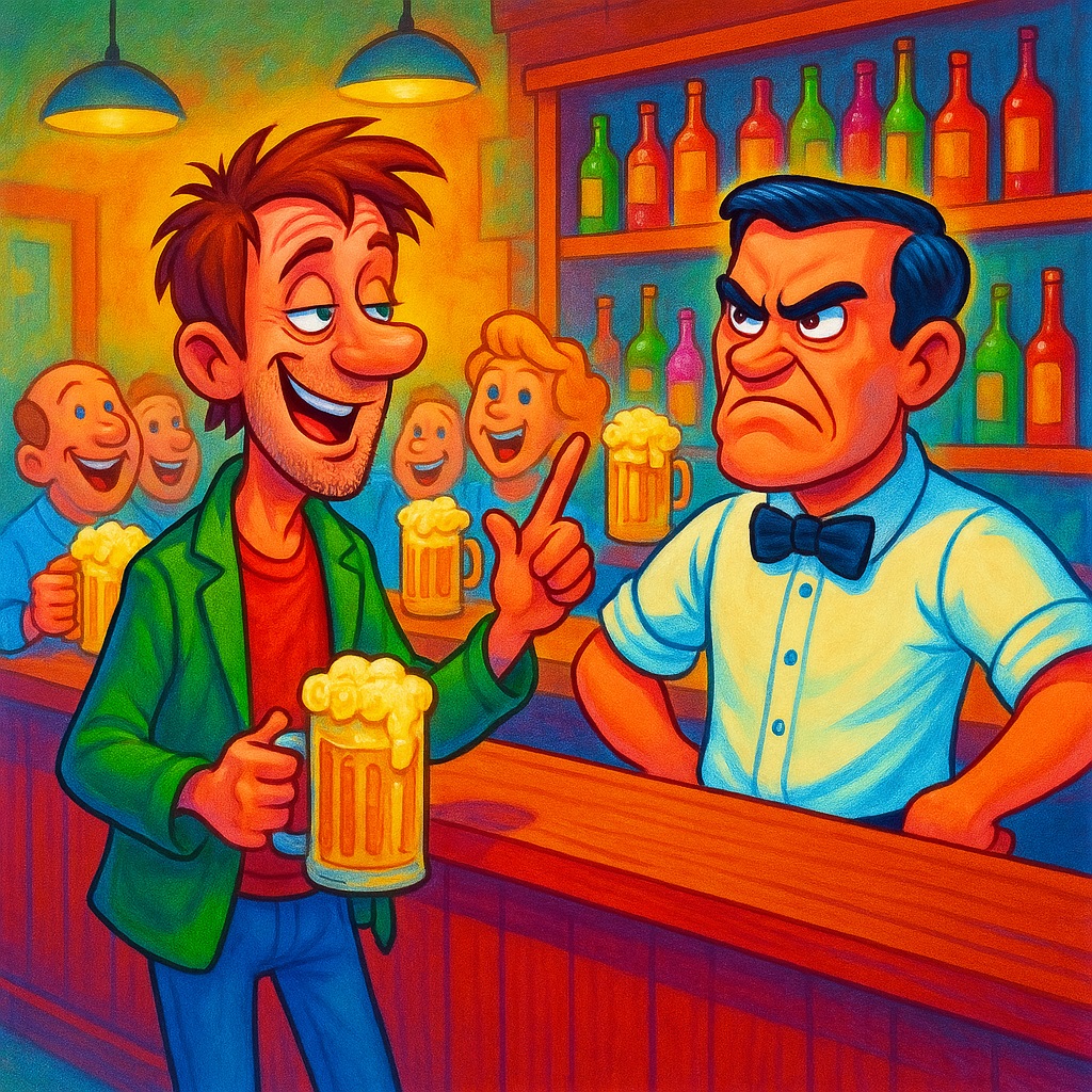 The bartender leans over and says, “You know, something funny happened tonight. Two men drank beer, neither paid, and both claimed they had. The next guy who tries that stunt is going to get punched in the — ”