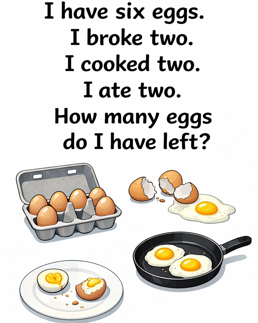 How? Well, if I had six eggs. Then I broke, cooked, and ate two of them; I’d still have four eggs. The text is written to fool you into thinking that all the eggs are gone. Clever, right?