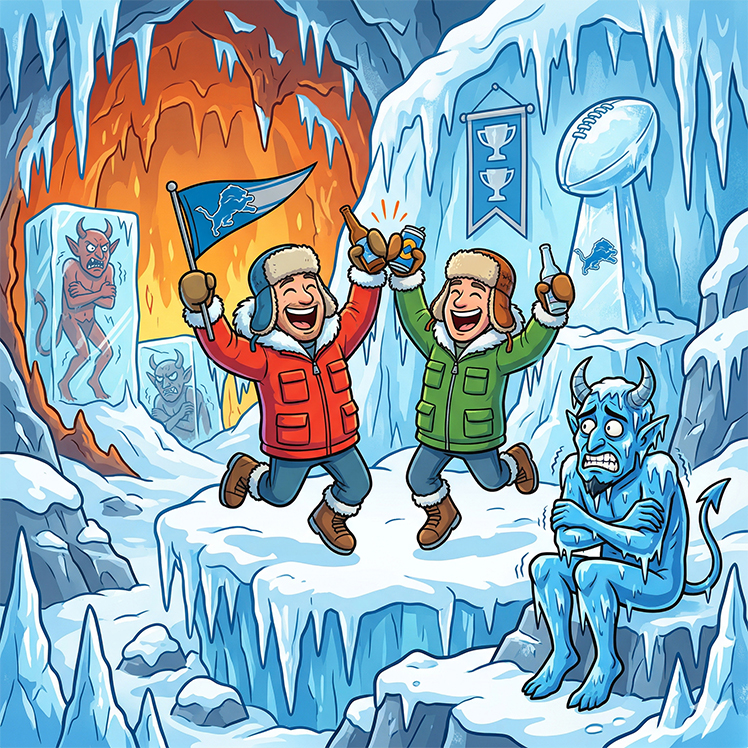 The Michiganders look at the devil in surprise. “Well, don’t ya know – if hell froze over, that must mean. The Lions won the Super Bowl!”