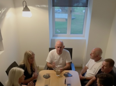 The first guy gets his sneakers out of his knapsack and starts putting them on.