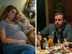 Two women realize that their apartment is on fire and go out onto the balcony.
