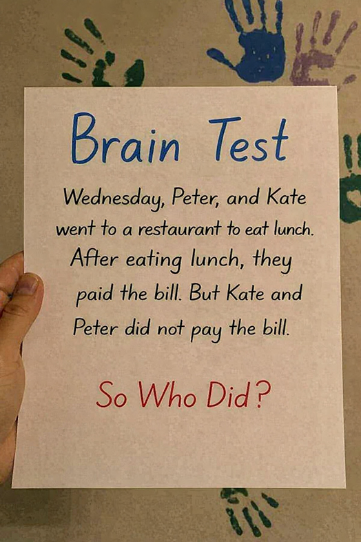 “Wednesday, Peter, and Kate went to a restaurant to eat lunch. After eating lunch, they paid the bill. But Kate and Peter did not pay the bill, so who did?”
