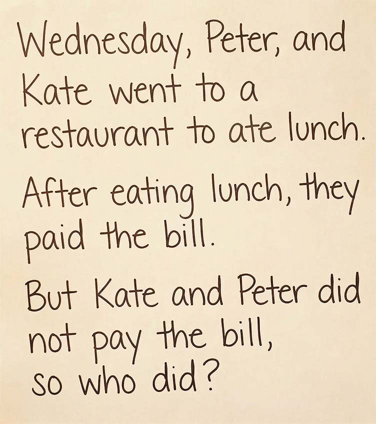 “Wednesday, Peter, and Kate went to a restaurant to eat lunch. After eating lunch, they paid the bill. But Kate and Peter did not pay the bill, so who did?”