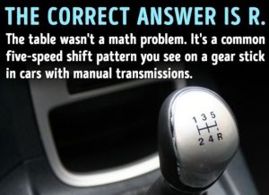 The positions align with gears where the missing number follows this pattern, and we are missing the reverse gear position, typically labeled as “R”.