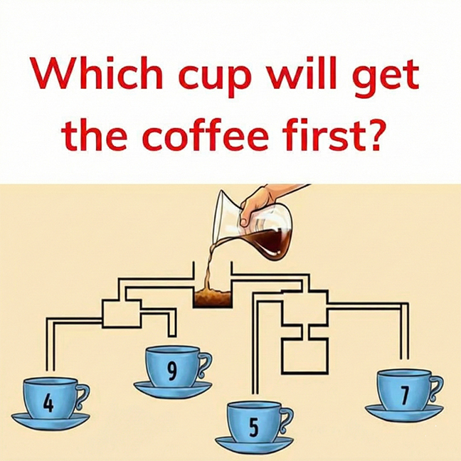 First things first, look at the illustration. There are 4 cups, each labeled with a number. Coffee is being poured into tubes hovering over the 4 cups. Which of the cups will get the coffee first?