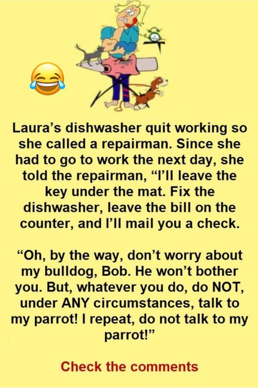 “Oh, by the way, don’t worry about my bulldog, Bob. He won’t bother you. But whatever you do, NEVER talk to my parrot under ANY circumstances! I repeat, don’t talk to my parrot!”