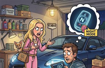 Carolyn, a rich blonde, buys a new automatic Jaguar XKR Sport.