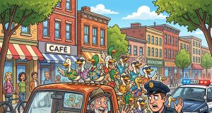 A man walks into a restaurant with a full-grown ostrich