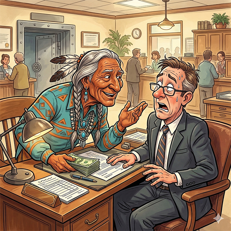 Then the Native American surrounded the desk to approach the employee and asked: “What do you have to give as collateral?”