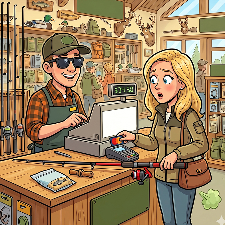 He smiles and replies, “Yes, ma’am. The rod and reel are $20, but the Duck Call is $11, and the Catfish Bait is $3.50.”